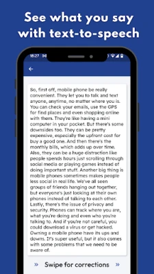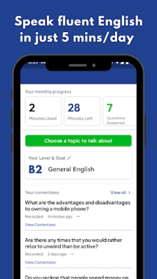 Get real-time A.I-powered corrections, it's like having an English teacher in your pocket whenever you want to practice speaking.
