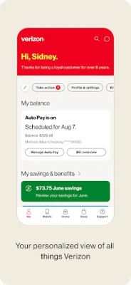 Meet the My Verizon app. Everything Verizon all in one place. When you launch the app you’ll see all the latest just for you. This is your personalized view, with customizable shortcuts, current balance, bill savings, perks, offers and more. And to find what you’re looking for faster, switch between different app sections using the tab bar.