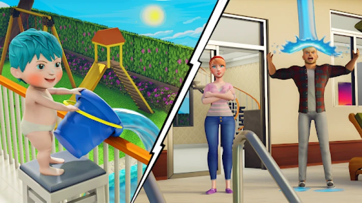 In another level of this Stylized Simulator Game You gonna prank your parents by throwing water bucket. You've to grab the stool from upstair playroom and then place it in the balcony then you've to grab the water bucket from lower guest room's washroom and place it on the stool after that you'll enjoy the waterfall on parents in this Naughty Baby Stylized Simulator.