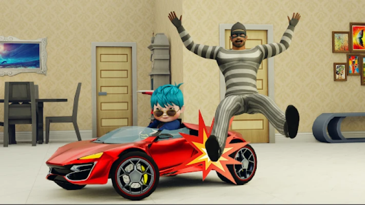 In another level of this Naughty Baby Stylized Simulator you'll enjoy the prank with thief. As a Naughty Baby you're left alone in the home and the thief jumps into your corridor for robbery you have to grab the anchor from grand bedroom and place it on the rope above main door now you'll enjoy the anchor smash on the thief while he was trying to entering the house you've to avoid the thief and grab fire extinguisher and spray it on the thief while he was getting hit Baby Super car.