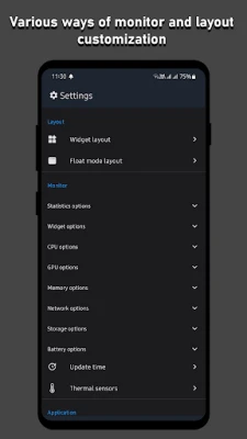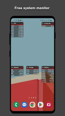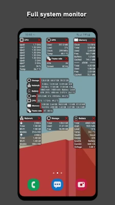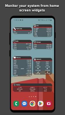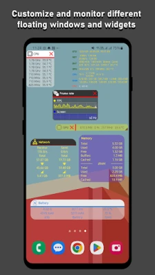 You can monitor system information in different types of floating windows (Vertical, Horizontal, Inline, Graphics) or use Android widgets on the home screen (Vertical, Horizontal)
