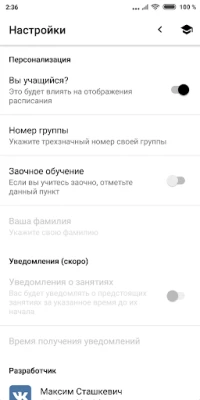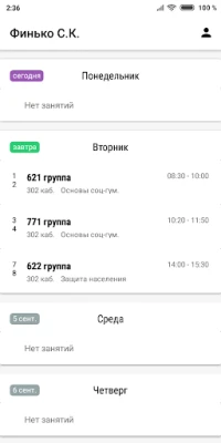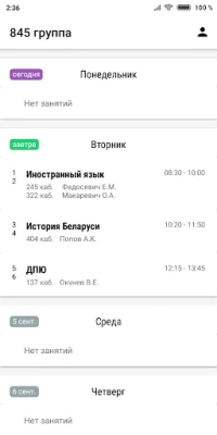 Расписание синхронизируется с официальным сайтом колледжа и красиво отображается по дням на целую неделю.