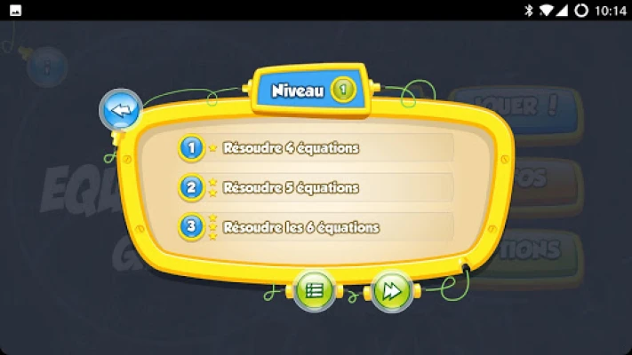 15 niveaux, correspondant à des degrés de difficulté croissants, sont disponibles. Il n’est possible de passer au niveau suivant que si le niveau en cours est validé (obtention d’au moins une étoile)